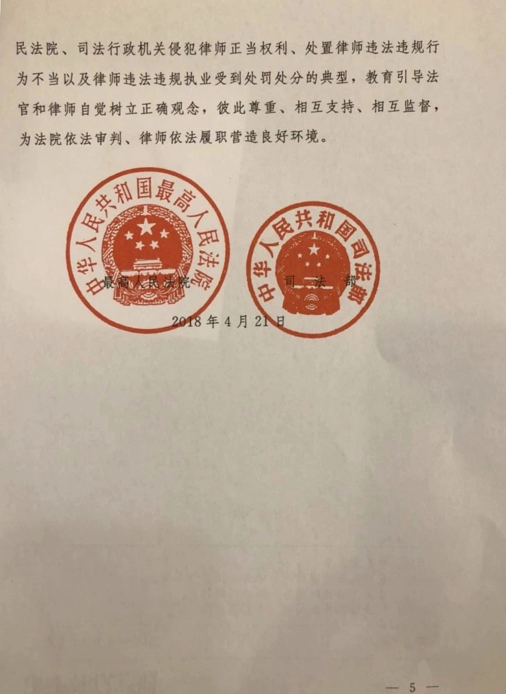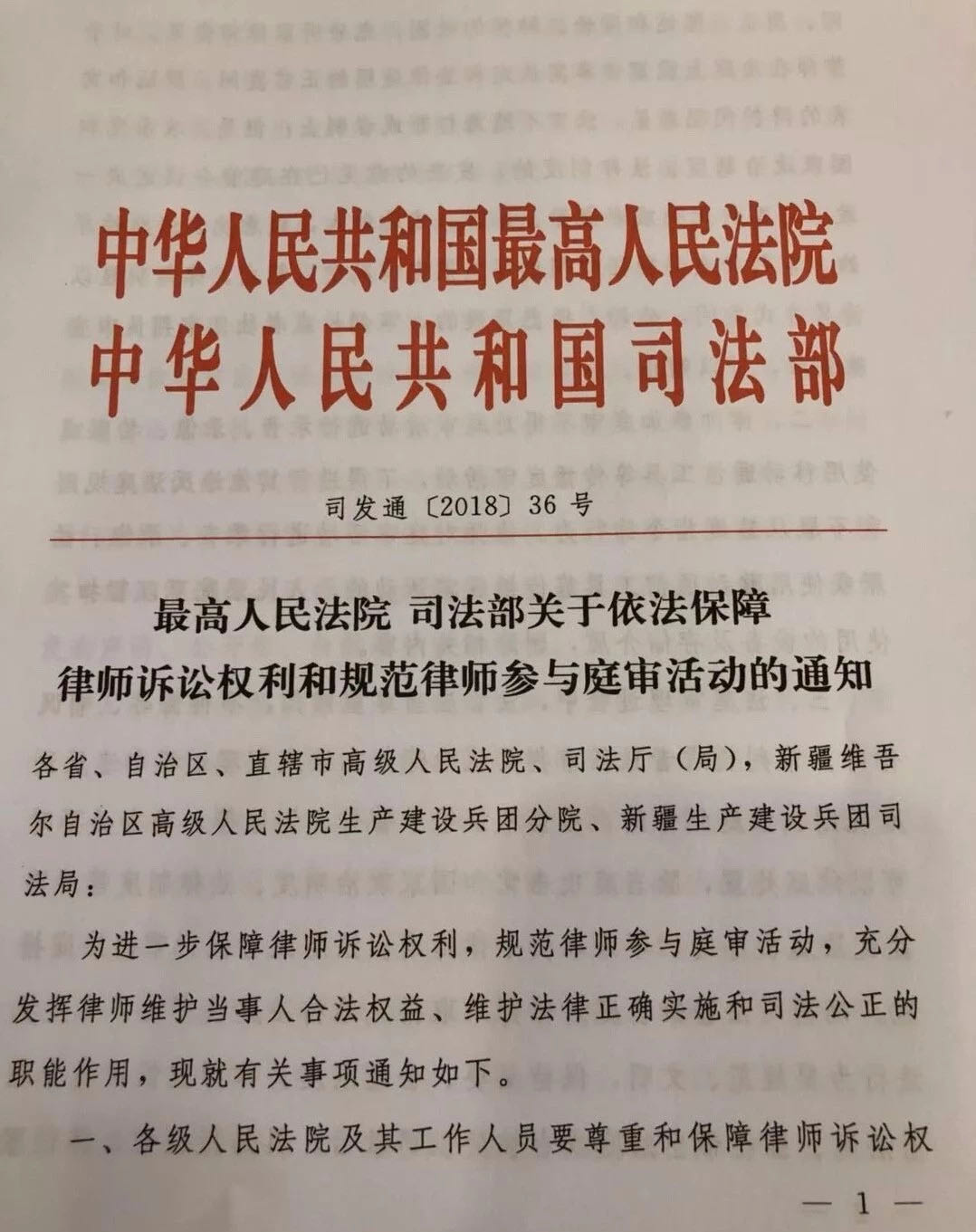 编者按:2018年4月21日,最高人民法院、司法部联合印发了《关于依法保障律师诉讼权利和规范律师参与庭审活动的通知》。《通知》是专门针对庭审环节律师权利保障和行为规范的第一个规范性文件,保障律师权利是该通知的重点内容。