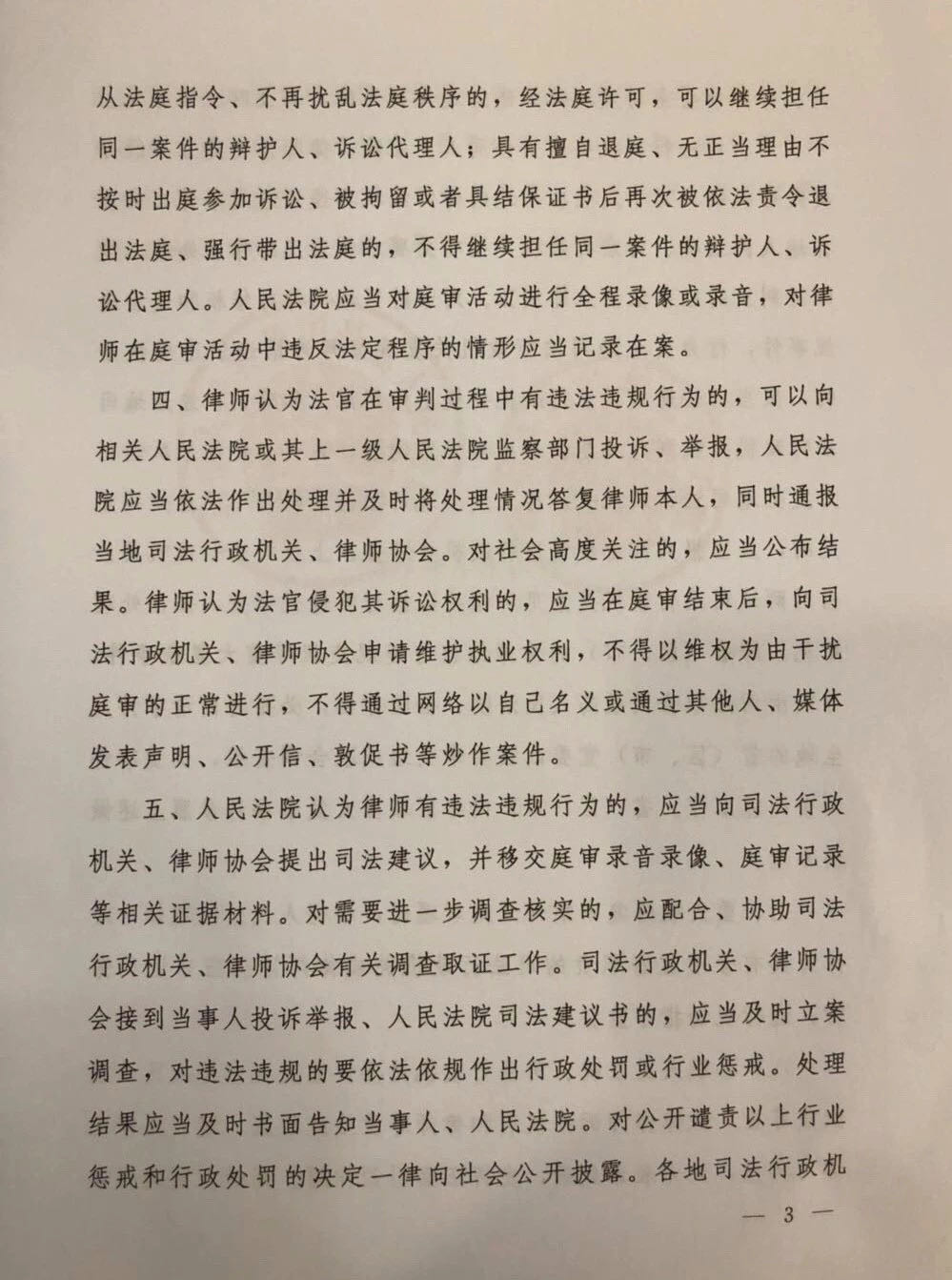 为进一步保障律师诉讼权利,规范律师参与庭审活动,充分发挥律师维护当事人合法权益、维护法律正确实施和司法公正的职能作用,现就有关事项通知如下。