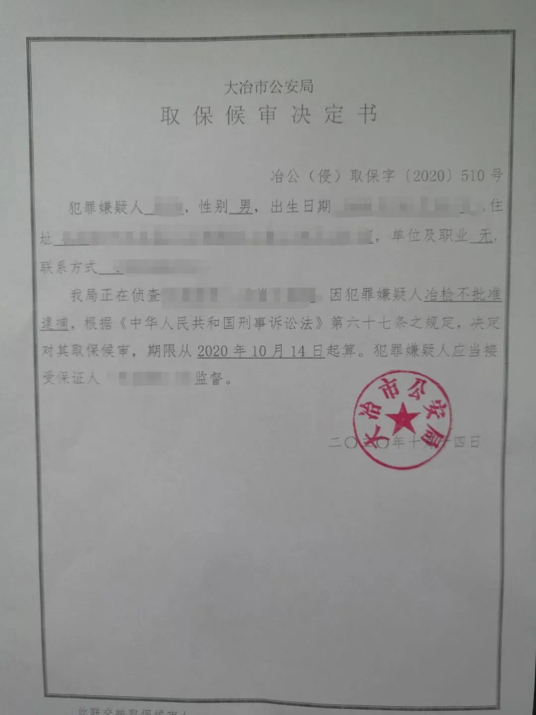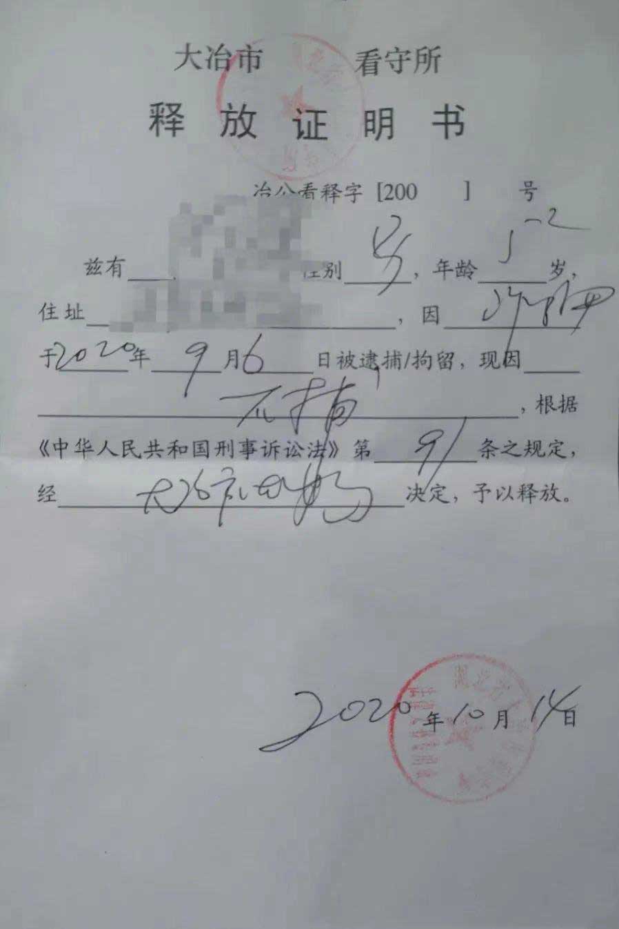 2020年10月14日,我们的当事人在被羁押37天后走出大冶看守所,回到了武汉的家中。